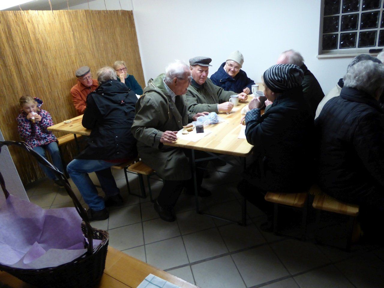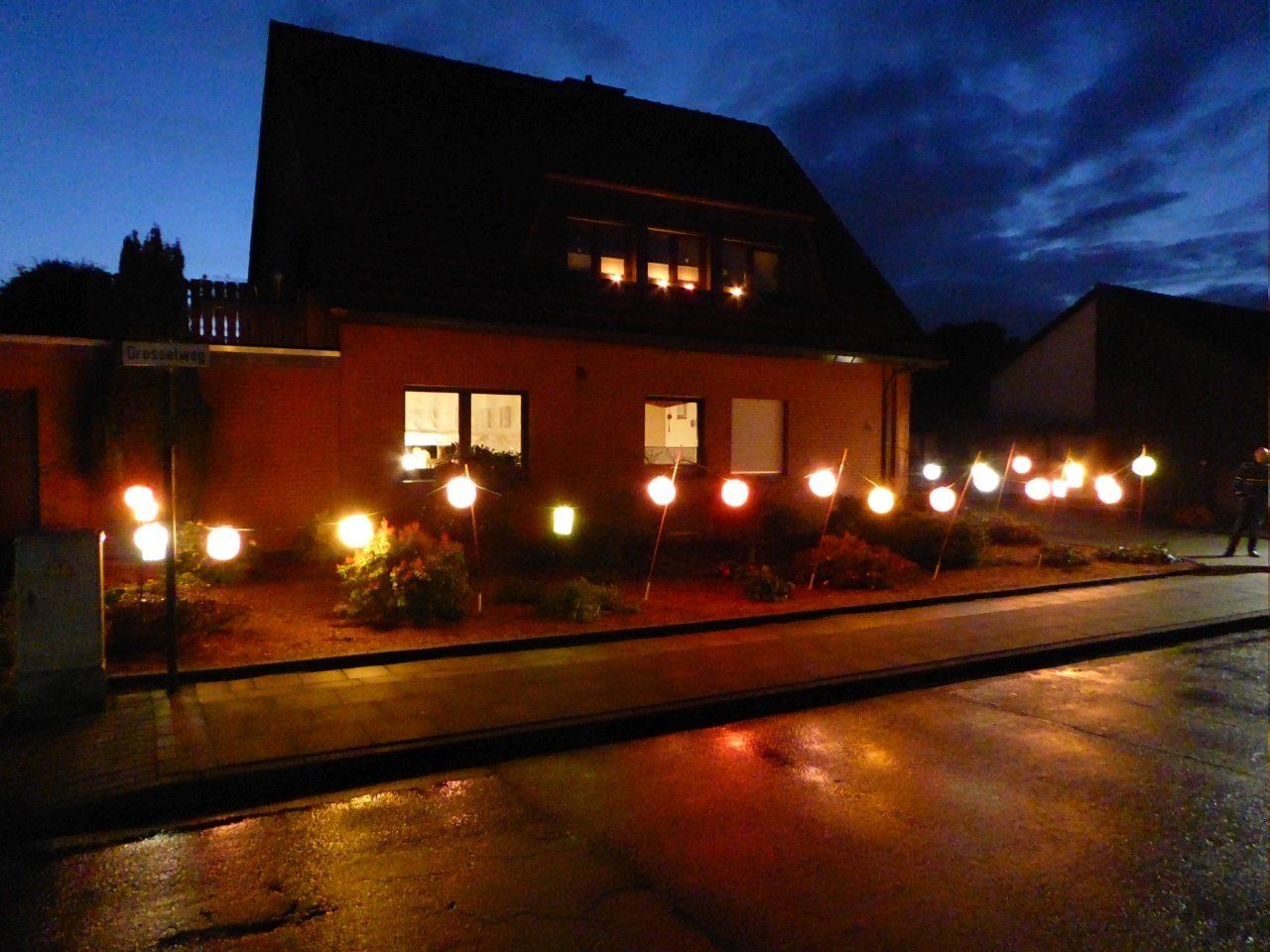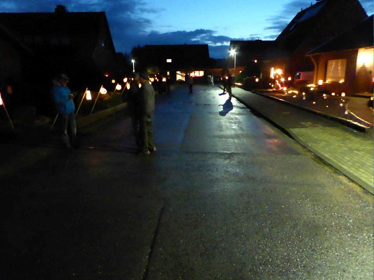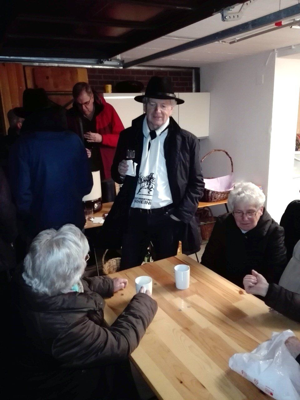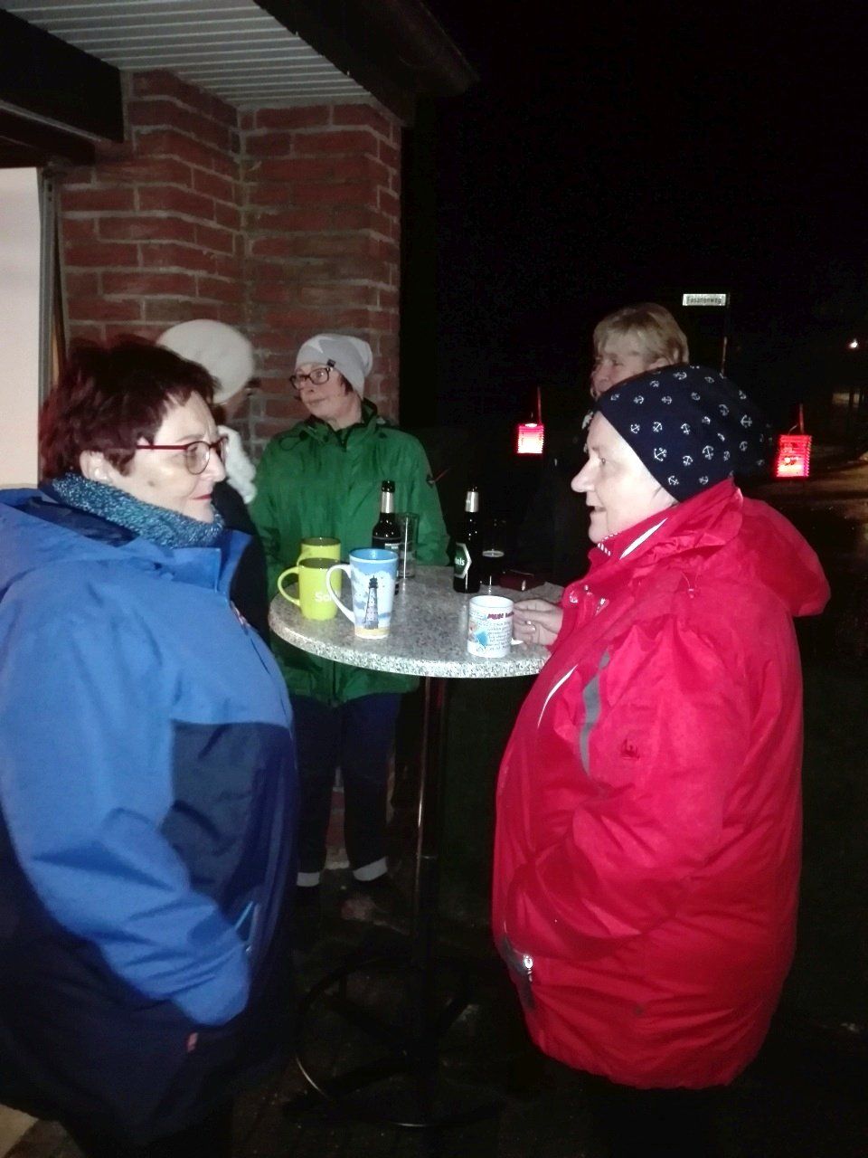 Anschließend gab es Würstchen und Glühwein in Ursels Garage. Dort fanden sich im Laufe des Abends über 40 Nachbarn an, erfreulich! Die Würstchen waren daher schnell verzehrt, nur den Glühwein haben wir nicht alle gekriegt. Nach ~ 20 Flaschen (!) war Schluss.
