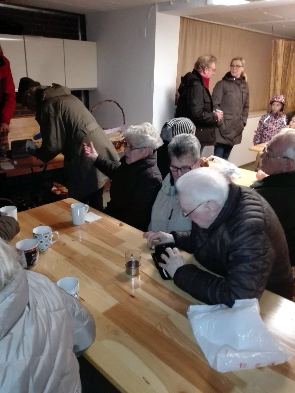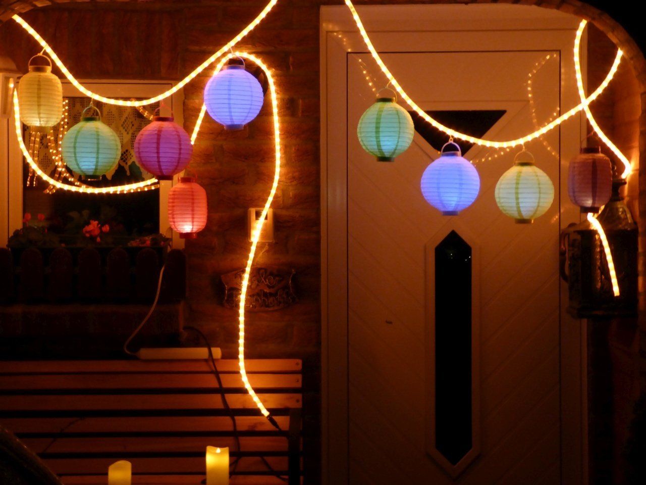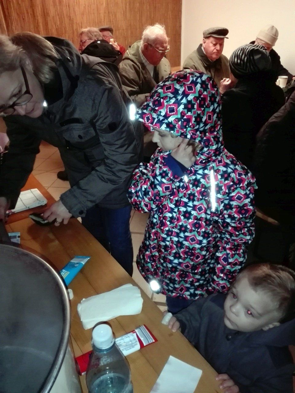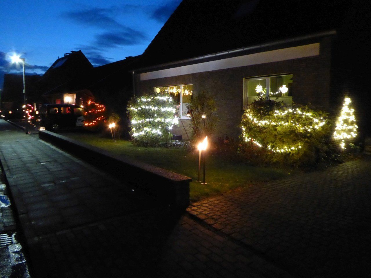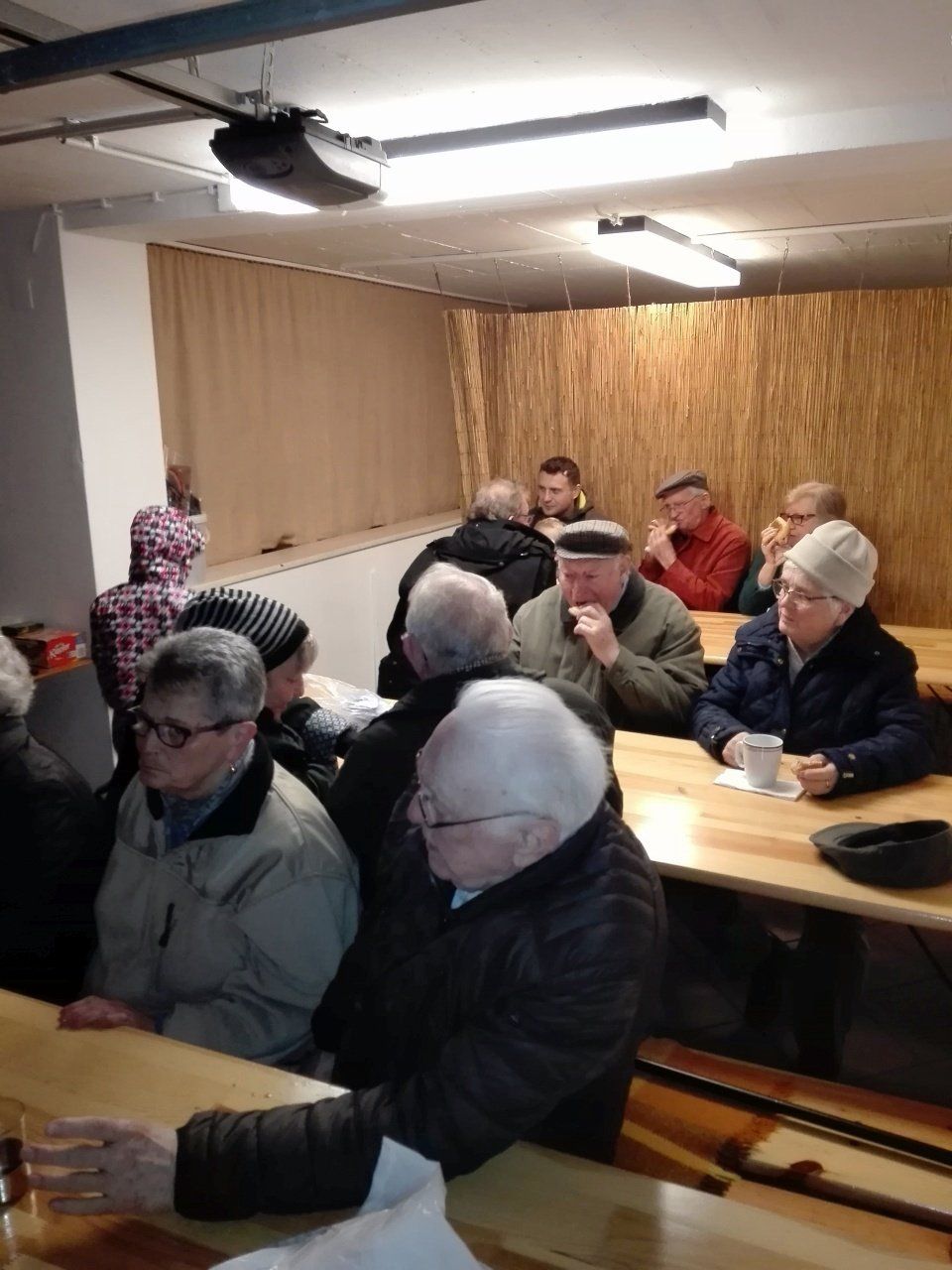Anschließend gab es Würstchen und Glühwein in Ursels Garage. Dort fanden sich im Laufe des Abends über 40 Nachbarn an, erfreulich! Die Würstchen waren daher schnell verzehrt, nur den Glühwein haben wir nicht alle gekriegt. Nach ~ 20 Flaschen (!) war Schluss.